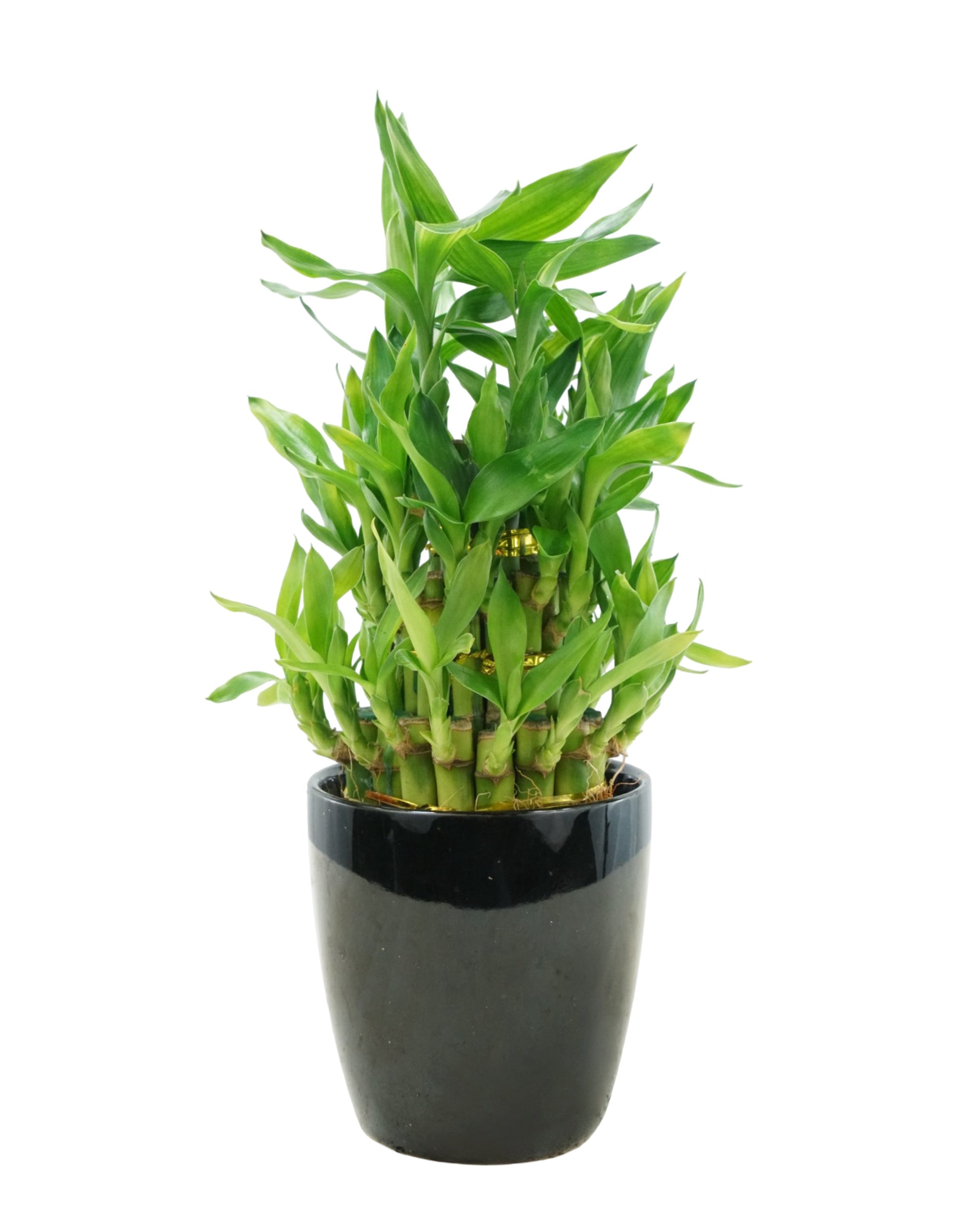 These Lucky Bamboo plants already live in decorative 4-inch pots, with a choice of black, red, or white leak-proof ceramic pots. This dracaena can be grown in water, but a pebble substrate is needed, and regular fertilization during the growing season and weekly changes of distilled water are required for best results.